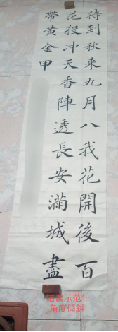 6.拍摄照片要求:考试为楷书创作。完成科目后,考生应在卷面左下角按压右手大拇指指纹之后按照主机语音提示,考生应手持作品向主机进行30秒展示;视频录制结束,按主机位屏幕提示在3分钟内拍摄作品定格照片与快递单照片并提交(后附作品拍照正确示范)。所拍摄图片质量要高,不可模糊不清,不可使用美图设备。如图片要求不合格,将失去评比资格。