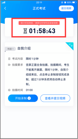 考试的页面上方为计时考试,请根据系统提示完成录制并提交视频。