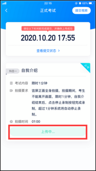 提交后,可以在“查看提交状态”里看到视频上传进度。提交成功或考试时间结束后,考试状态显示已结束。