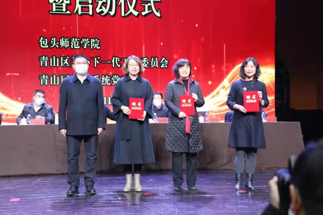 包头师范学院党委书记王永明,市教育局党组书记、局长张文科,区委副书记、政法委书记、关工委名誉主任、教育系统党工委书记李培文,区政府副区长李文杰共同为“家校社协同育人联盟——包头师范学院教科研基地”揭牌,并聘请我校教师教育学院院长郝红英、教育科学学院副院长刘俊英、教师吴晓艳为专家指导组成员。