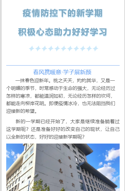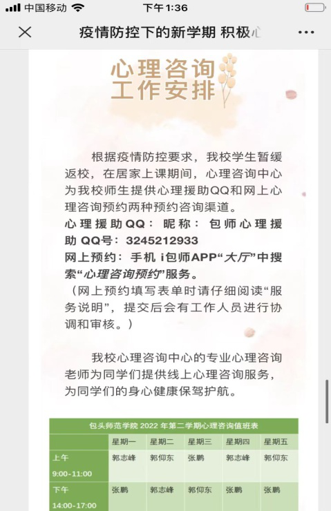 ——在暂缓返校,线上开学的情况下,包师心理咨询中心特为同学们开通了心理援助QQ和学校智慧校园平台的“心理咨询预约”服务两种心理援助渠道,以线上的形式,全天候为大学生提供心理健康服务。通过公众号,易班等平台,推送心理调适技巧等内容,为学生居家学习下的心理调节提供有效建议。