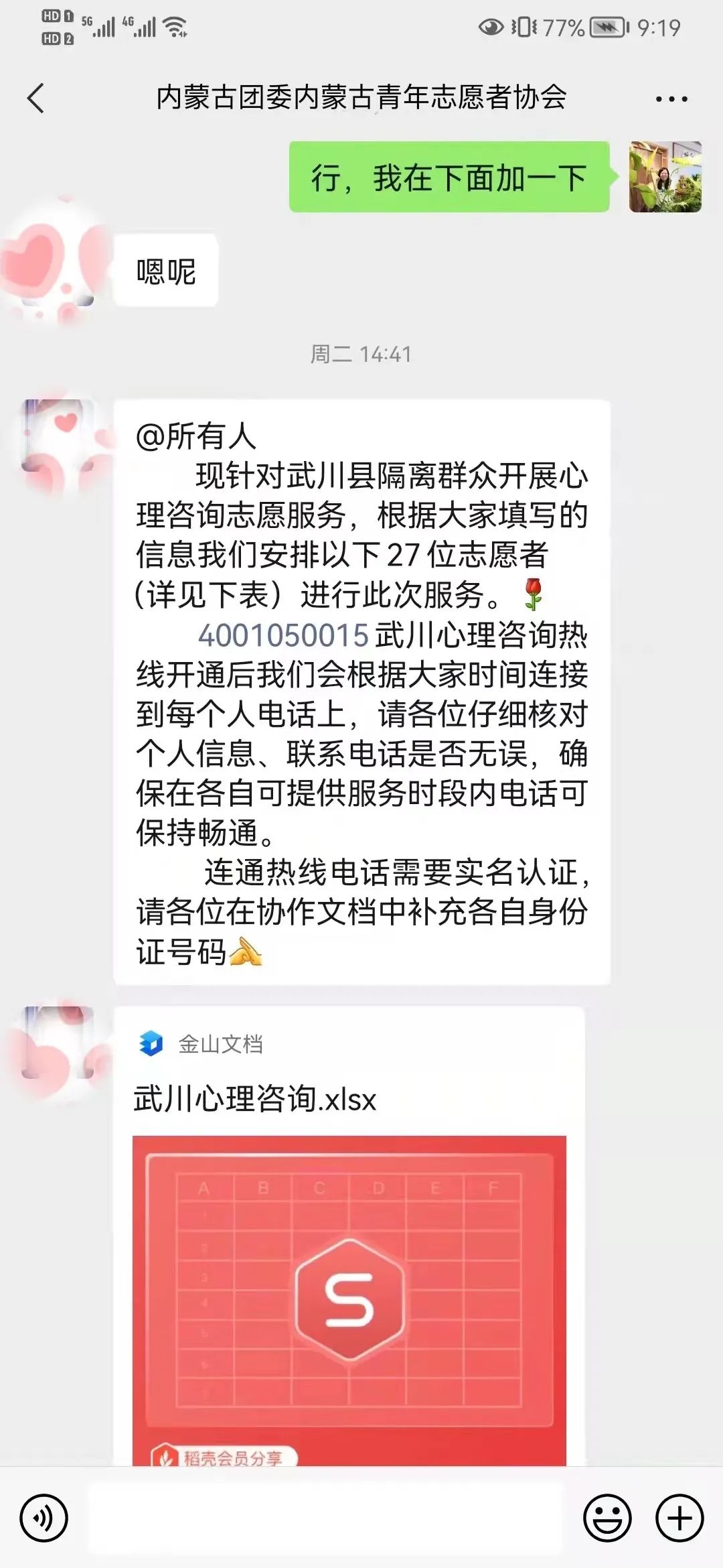 物理科学与技术学院在读博士王文星老师积极报名参加内蒙古团委内蒙古青年志愿者协会组织的线上心理咨询的志愿者工作,目前服务武川。