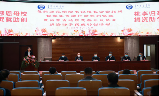 为贯彻落实习近平总书记关于就业和创新创业工作重要指示批示精神,落实教育部、教育厅“关于高校书记校长访企拓岗促就业专项行动”的要求,2022年4月25日下午,我校在博学楼学术报告厅举行书记校长访企拓岗促就业专项行动签约仪式暨内蒙古鸿雁慈善公益协会捐资助学促就助创活动。我校党委书记王永明,校长金桩,校党委委员、副校长王有亮,校党委委员、副校长双山,包头市人社局大就办主任贾勇,内蒙古鸿雁慈善公益协会领导、企业代表,相关部门负责人,各学院党总支书记、副书记、学工办主任、辅导员及学生代表参加了线上线下活动。会议由校党委委员、副校长格根哈斯主持。