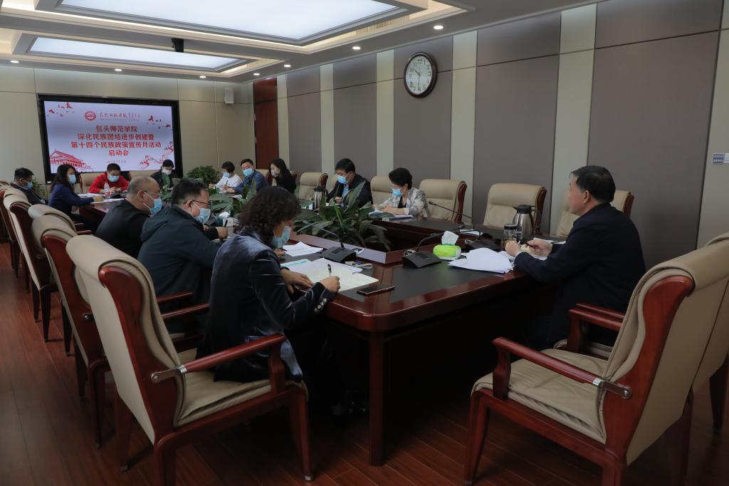 为深入学习贯彻习近平总书记关于加强和改进民族工作的重要思想和对内蒙古重要讲话重要指示批示精神,全面落实中央、自治区党委和包头市委民族工作会议精神,进一步加强党的民族理论政策宣传教育,有形有感有效抓实做细广大师生铸牢中华民族共同体意识教育各项工作,5月12日,学校召开深化民族团结进步创建暨第十四个民族政策宣传月活动专题会议。校党委副书记施纪华主持会议,学校民族团结进步创建各专项行动牵头部门负责人参加会议。