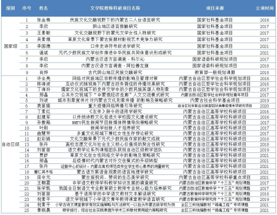 学科研究以基础研究为主,兼顾应用研究。基础研究集中于多元文化交融与文学研究、蒙古族生态文学研究、少数民族语言接触研究、自治区区域语言研究、自治区本土作家研究等方向,近五年,专业教师获批国家社科基金项目6项、教育部人文社会科学规划课题1项、国家语委项目2项、省部级教科研项目近30项,其中内蒙古自治区哲学社会科学规划项目5项,内蒙古自治区高等学校科研项目13项,市、校级项目15项,发表学术论文160余篇,其中核心刊物上发表论文35篇,出版著作18部。