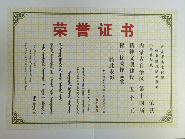 3、原创歌曲《雨露阳光》获内蒙古自治区精神文明建设“五个一工程”奖