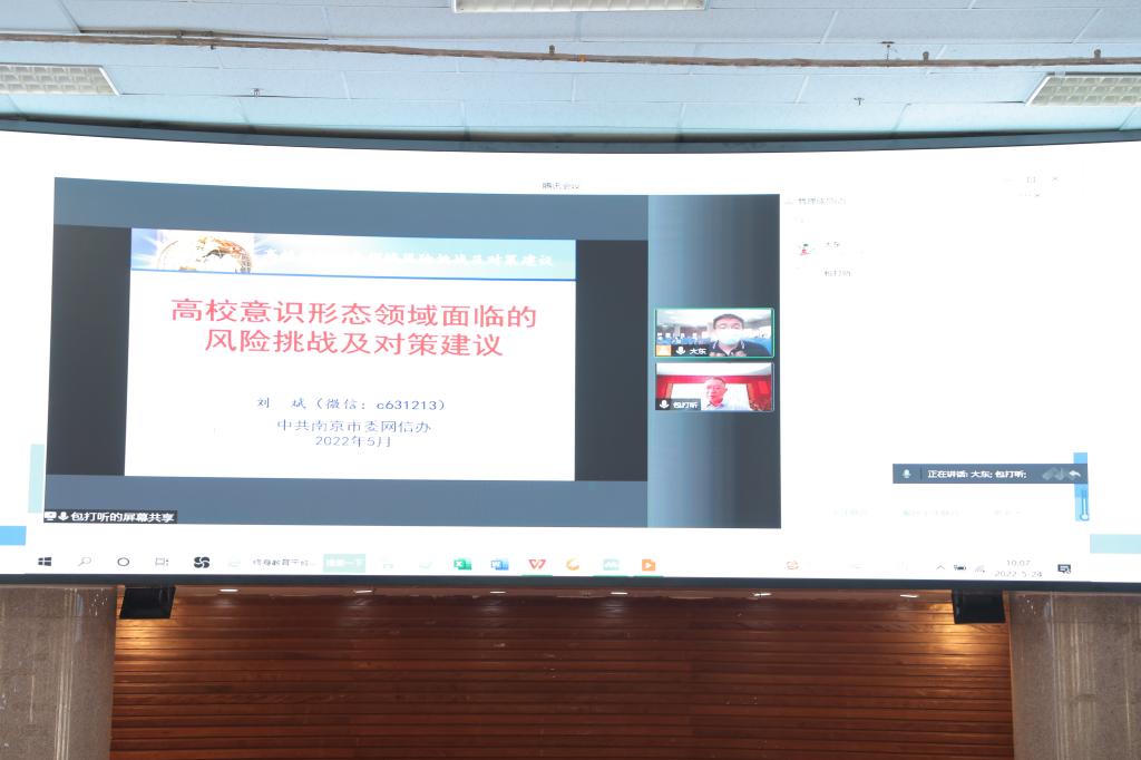 培训会上,南京市委网信办常务副主任刘斌作了题为《当前高校意识形态领域面临的风险挑战及对策建议》的线上讲座。他结合多年的舆情处置实战指挥经验和高校发生的意识形态领域实际案例,对高校意识形态问题的突出表现进行了深入的剖析,就高校网络舆情特点和做好高校意识形态工作的相关建议做了精彩讲解。讲座以案为例,深入浅出,具有很强的指导性和实践可操作性,为我校辅导员、宣传信息员进一步做好高校意识形态工作理清了思路,拓宽了视野,给予了很好的指导。