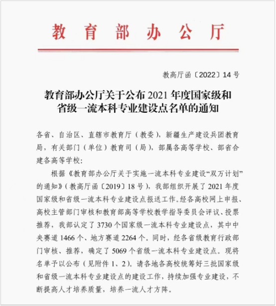 近日,教育部公布了2021年度国家级一流本科专业建设点名单。本年度我校推荐的汉语言文学、小学教育、历史学、计算机科学与技术4个专业全部获批2021年度国家级一流本科专业建设点,获批率100%。实现了我校一次性获批4个国家级一流本科专业建设点的历史性突破。截至目前,我校国家级、自治区级一流本科专业占学校专业总数的27%。在全区参加地方赛道评选的高校中,我校本次获批国家级一流本科专业建设点数量位列全区第三,同类院校位列第一。