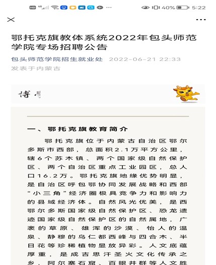 就业是民生之本,是经济发展和社会稳定的重要保障。6月26日,学校利用毕业生陆续返校的契机,召开了“鄂托克旗教体系统包头师范学院专场招聘会”。此次招聘会由鄂托克旗教育局主办,学校招生就业处承办的,共吸引学校83人报考,现场共66人参加面试。