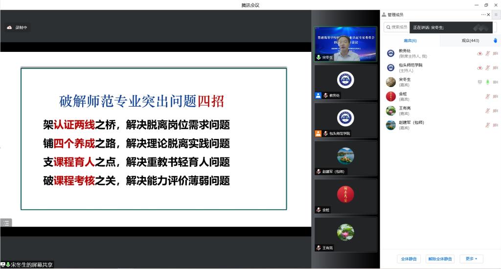 为进一步推进我校师范类专业认证工作,6月30日,国家教育部师范类专业认证专家委员会学术委员会主任宋冬生,受邀在线上为我校作专题讲座。校长金桩,校党委委员、副校长王有亮参加讲座。校内师范类专业认证专家,校级督导在办公楼第二学术报告厅参加此次讲座。各职能部门负责人、师范类专业全体教师、教务处全体教师等近五百人在线上聆听了讲座,教务处处长赵建军主持讲座。