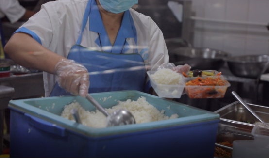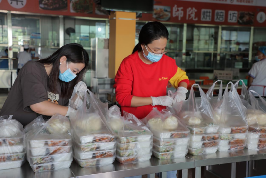 用餐是最重要的问题之一,后勤食堂的师傅们今天忙到“起飞后无法落地”。学校静默两天,学生不出门,饭菜要掐着时间提前做好,由志愿者点对点送餐至宿舍楼,确保用餐时间每个学生都能吃到荤素搭配好的饭菜。