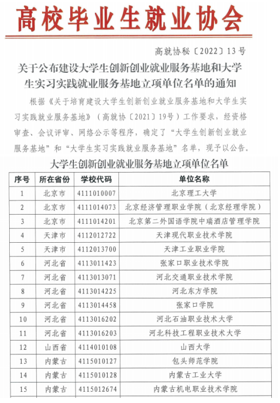 近日,教育部高校毕业生就业协会公布了关于建设大学生创新创业就业服务基地和大学生实习实践就业服务基地立项单位名单,我校被评为“全国大学生创新创业就业服务基地”,内蒙古自治区高校仅有三所学校获此殊荣。
