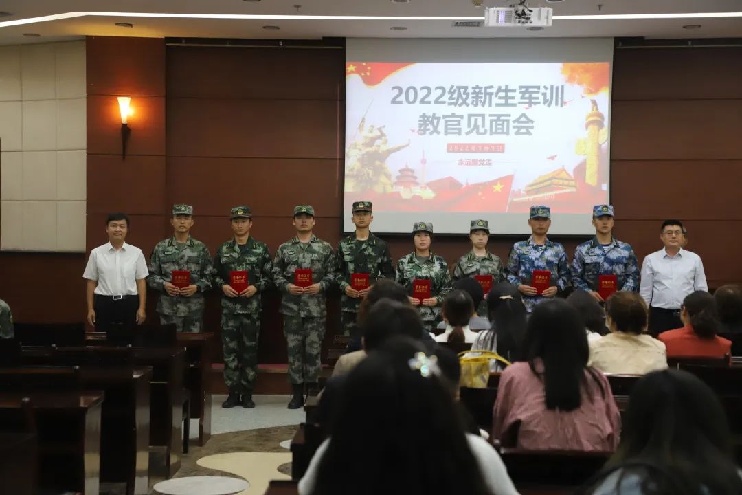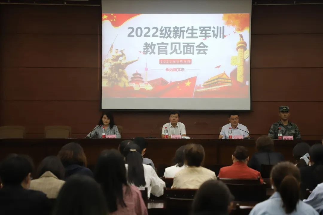 2022年9月9日,学校召开军训教官见面会,军训团团长薛志东、军训团政委赵建军出席会议,武装部副部长杜志敏主持会议,各学院分管领导、学工办主任、辅导员、班主任代表和教官代表参加。