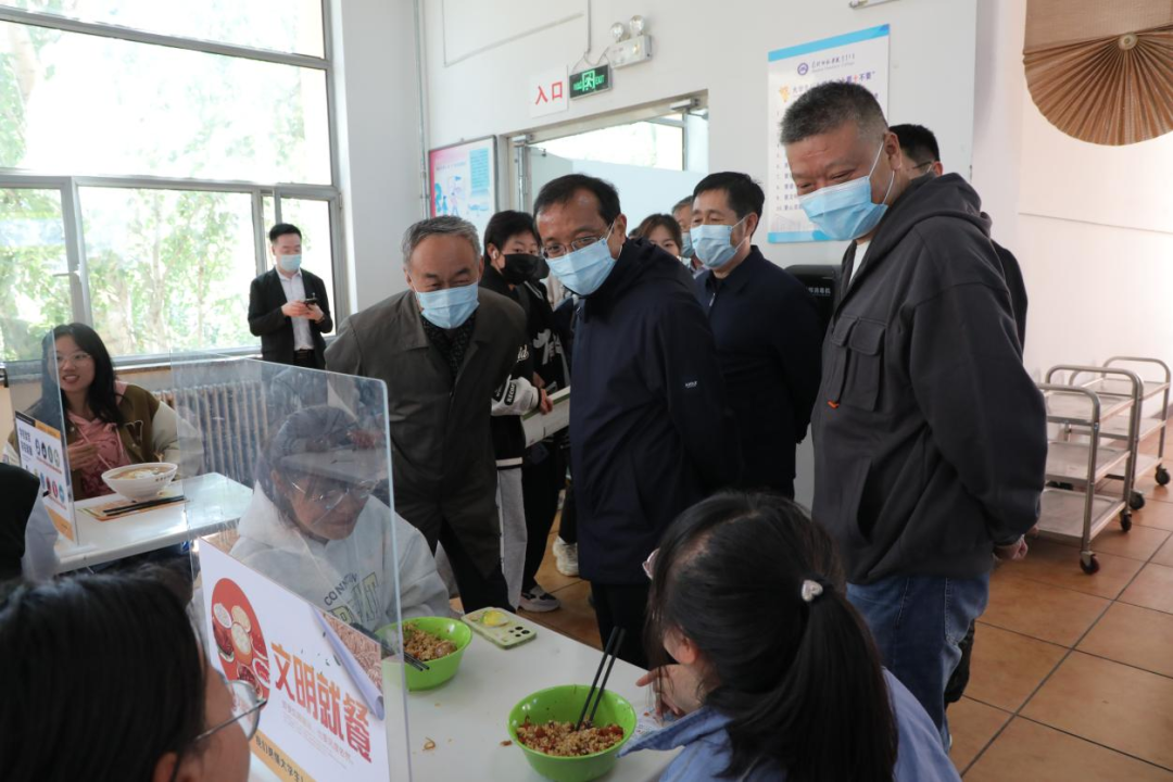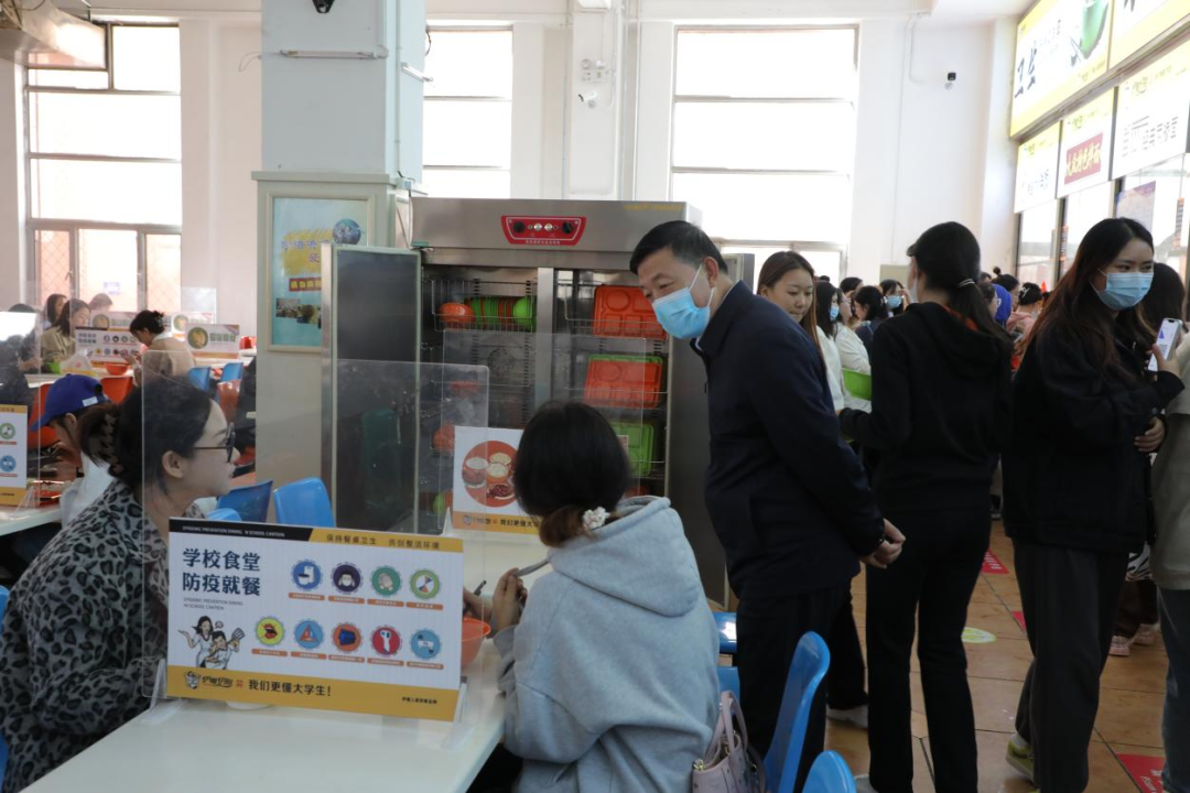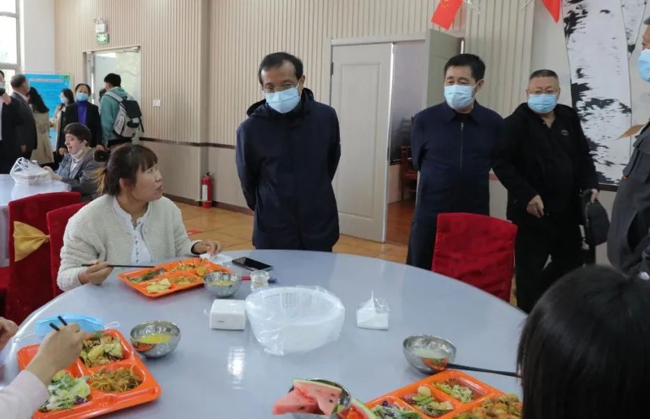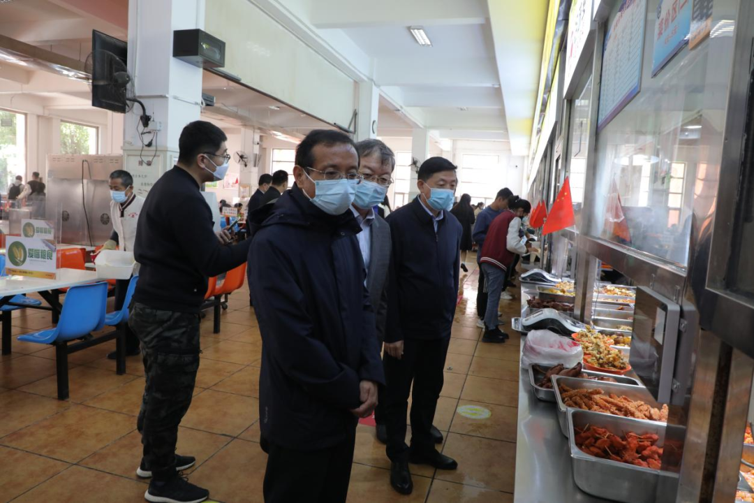 在餐厅,校领导实地走访了学生食堂和教职工食堂各服务窗口,走到饭桌前仔细询问同学们餐厅饭菜质量、价格以及对学校管理服务工作的意见和建议等。嘱咐身边的工作人员,要时刻树立“一切为了学生”的服务理念,做好每一道菜,把好每一道食品安全关,为同学们创造平安和谐美好的校园环境,在疫情期间,尽心竭力做好大家的学习生活保障工作。