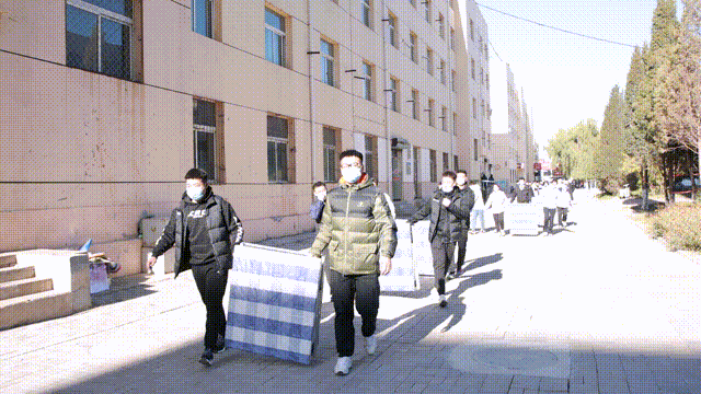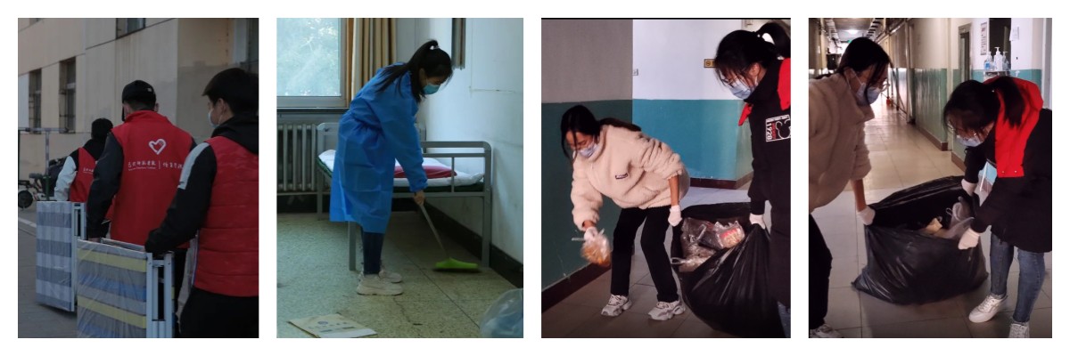 同时各学院学生党员志愿者还承担了宿舍楼环境卫生,午餐晚餐的餐余垃圾处理等工作,体育学院的志愿者们为增设的隔离点搬运物资。
