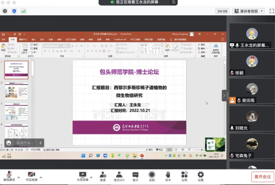 10月21日晚,由包头师范学院科技处主办,生物科学与技术学院承办的“博士论坛”以线上汇报的形式成功举办。会议由生物学院院长刘晓光主持,来自生物学院和其他学院的师生代表60余人参加了本次论坛。