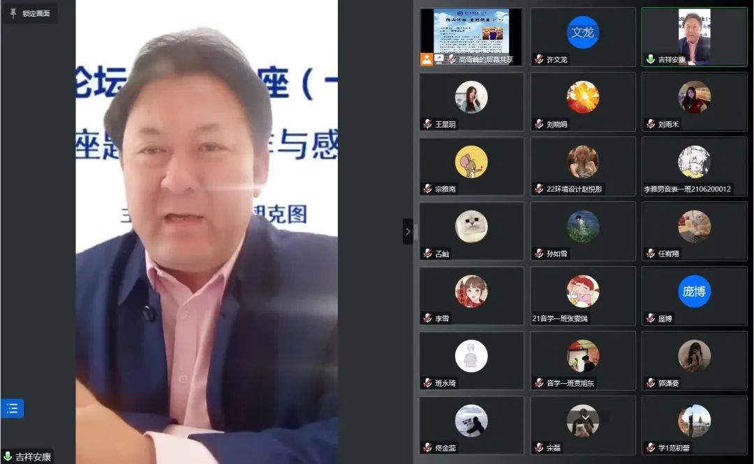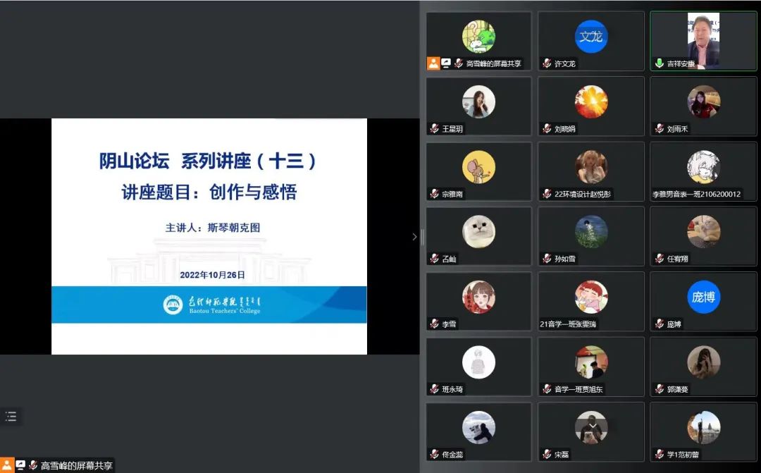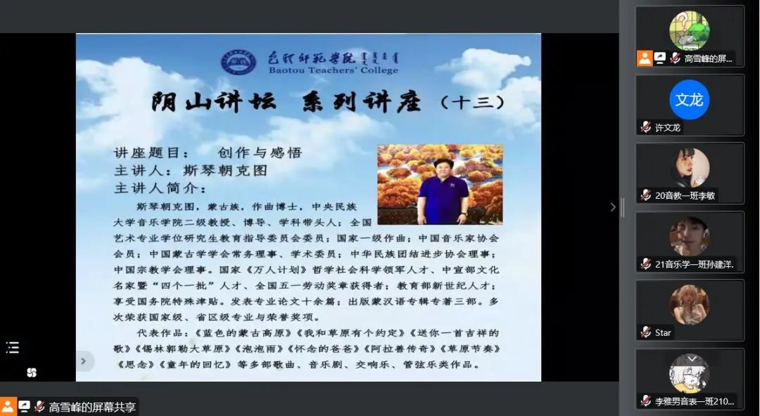 10月26日晚19点,我校通过线上形式举办了“阴山论坛”第十三期讲座,学校特别邀请中央民族大学音乐学院教授、博士生导师、学科带头人斯琴朝克图老师为我校师生带来题为“创作与感悟”的专题讲座。讲座由校团委书记刘晓娟主持。