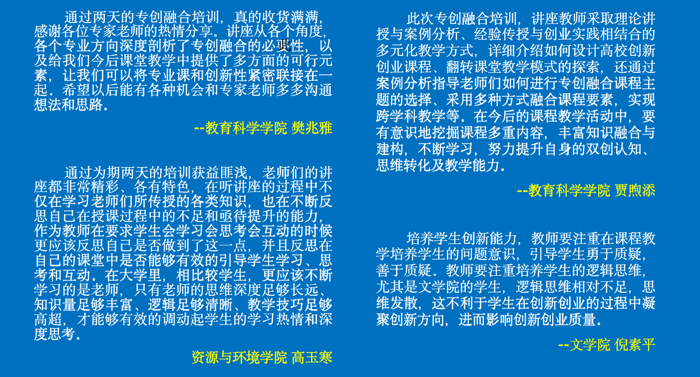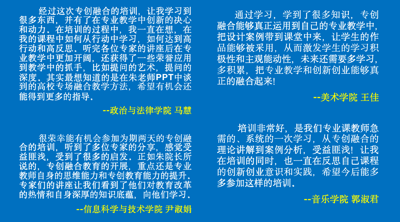 培训后,老师们表示,本次培训及时有效,为专业教育教学改革提供了新思路、新路径,有效解决了大家在专创融合过程中存在的困惑和问题,有效提升了自身对于专创融合的认知水平。通过此次培训,进一步提高了教师们在课堂上的教学水平,不断提升教师们专创融合的能力,助力人才培养的高质量发展。