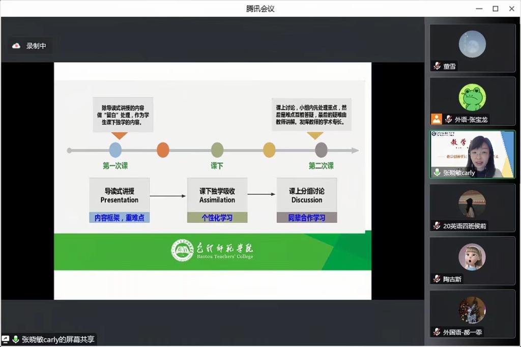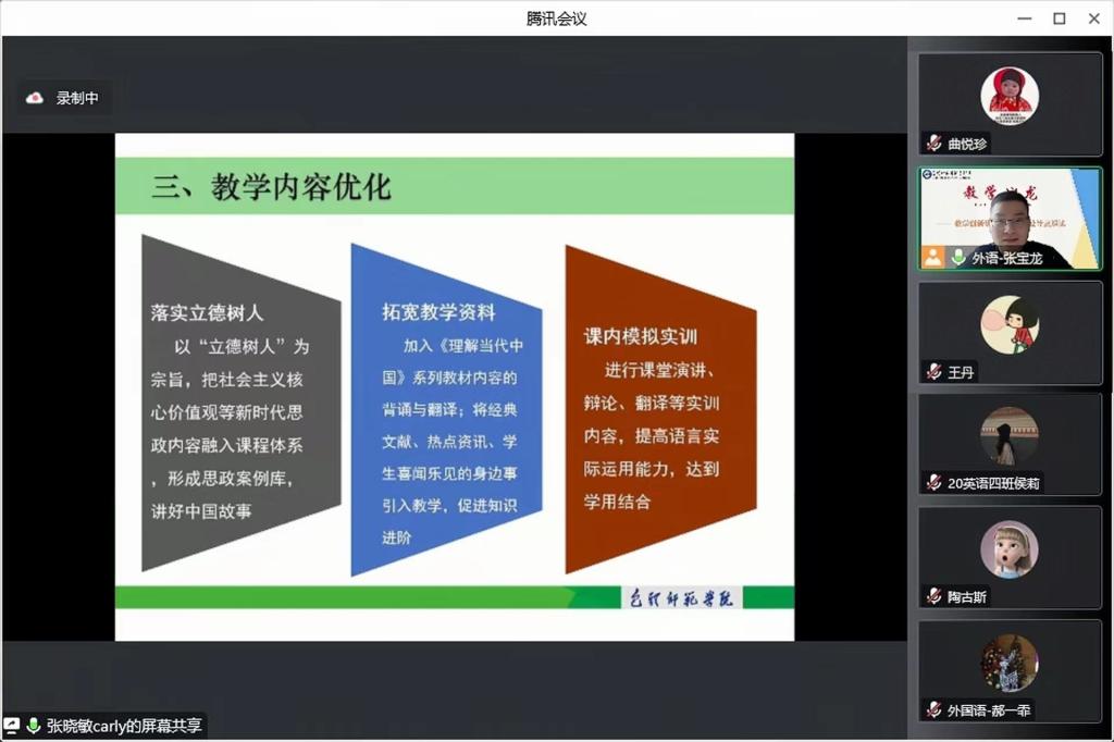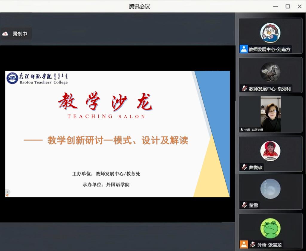 11月11日,由教师发展中心与教务处共同主办,外国语学院承办的“教学创新研讨—模式、设计及解读”主题教学沙龙活动通过线上顺利进行。本次沙龙活动分别邀请我校外国语学院张晓敏、张宝龙和曲悦珍三位教师进行了教学创新经验分享。校党委委员、副校长王有亮出席此次活动,外国语学院领导班子成员、教师发展中心全体人员、外国语学院全体教师及相关学院部分教师和学生近120余人通过腾讯会议参加此次活动,活动由外国语学院副院长赵阿茹娜主持。