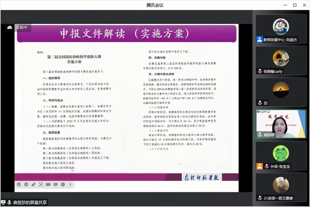 曲悦珍老师以“第二届高校教师教学创新大赛申报流程解读”为主题,以任教的《口译》课程为例,通过申报文件解读、申报材料准备和参赛体会三个方面深刻阐明了创新与实践教学的必要性,提出了实践教学可以进一步平衡学生理论知识与实践技能的综合能力,有助于解决在有限的课时下如何实现理论知识与实践技能综合能力的提升。最后强调要转换教学理念,将课程思政融入整个教学全过程,实现教学目标与学科育人同向同行。