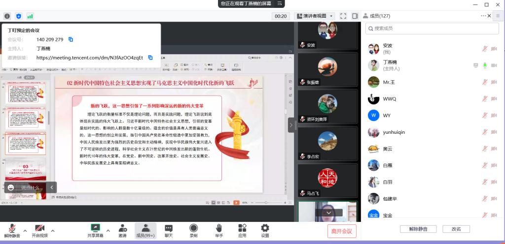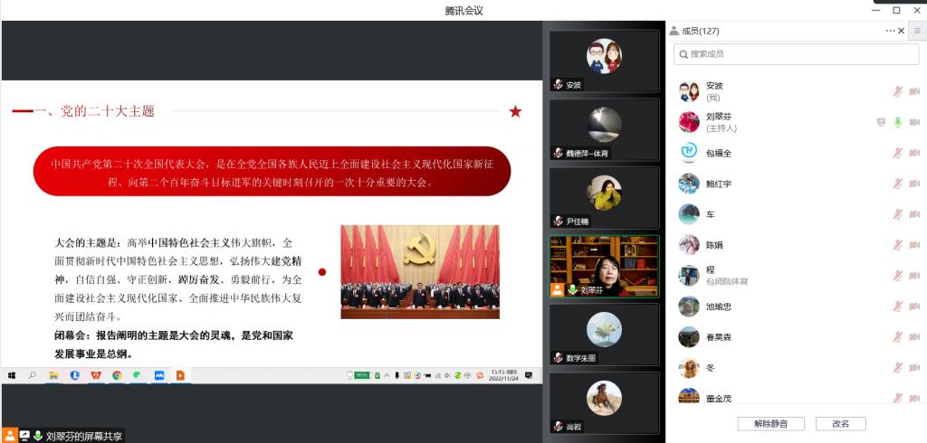 全校教职工云端相聚,认真听讲,在宣讲中不断学习、深刻领悟党的二十大精神的丰富内涵和精神实质,收获满满。下一步,学校将以学习党的二十大精神为主题,以讲述新时代十年党和国家事业发展取得的历史性成就为主线,深入到教师和学生中,持续开展宣讲活动,在校园内掀起学习宣传贯彻党的二十大精神热潮,让党的二十大精神真正入脑入心、见行见效。