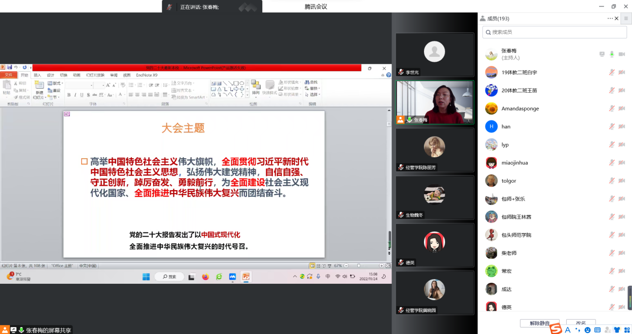 为引导全校广大教职工深入理解“九个深刻领会”“五个牢牢把握”“三个全面”“七个聚焦”等方面的重要要求,准确把握党的二十大提出的一系列重要思想、重要观点、重要战略、重要举措,真正把思想和行动统一到党的二十大精神上来,把智慧和力量凝聚到落实党的二十大确定的目标任务上来,根据《中共包头师范学院委员会关于深入学习宣传贯彻党的二十大精神的通知》《关于开展党的二十大精神巡讲活动的通知》安排部署,11月24日,我校通过腾讯会议平台为全校教职工进行了第一轮宣讲。