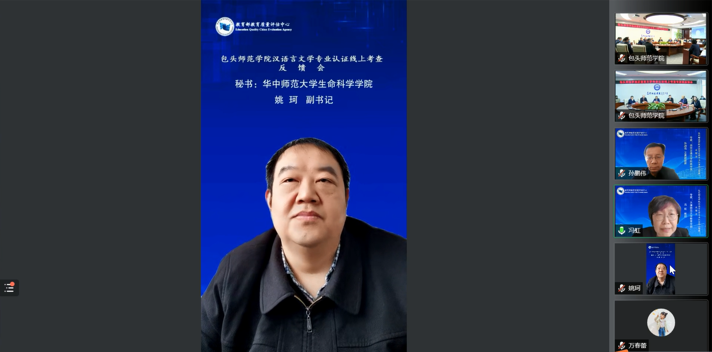 11月25日上午,包头师范学院汉语言文学专业认证线上考查专家组意见反馈会于线上和第二学术报告厅同步举行。专家组全体成员石竹青、冯虹、孙鹏伟、姚珂在线上出席会议,评估中心特别邀请陕西省教学能手万春蕾老师作为观察员参与本次认证。校领导黄海、施纪华、王有亮、双山、杨春生、格根哈斯出席会议。学校专家组全体成员、职能部门负责人、各学院领导班子、文学院全体教师、师范类专业系主任及教研室主任、公共课教研室主任、校内认证专家、校级教学督导、教务处全体人员参加会议。本次会议由专家组组长石竹青教授主持。