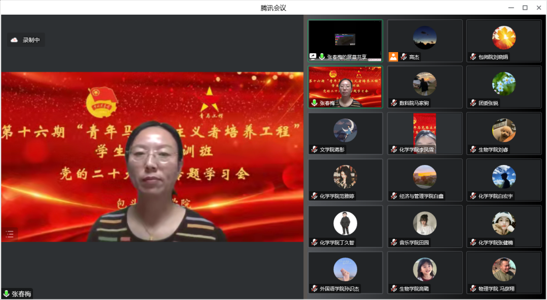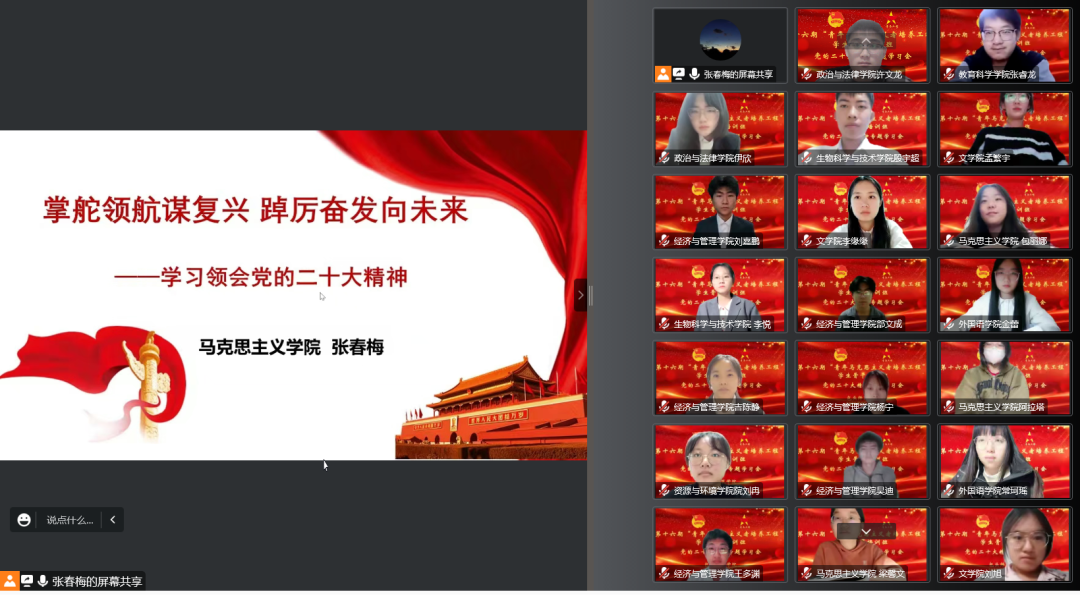 为深入学习宣传贯彻党的二十大精神,加强对青年学生的思想政治引领和理想信念教育,带动广大青年深入学习、认真领会、准确把握党的二十大精神,充分发挥我校青马工程学员在学习宣传贯彻党的二十大精神中的示范引领作用,11月29日晚我校第十六期“青年马克思主义者培养工程”学生骨干培训班学习宣传贯彻党的二十大精神专题培训系列讲座之《掌舵领航谋复兴 踔厉奋发向未来》,通过线上集中培训的方式成功举办。我校教师团干部、本期青马班全体学员参会,校团委书记刘晓娟主持会议。