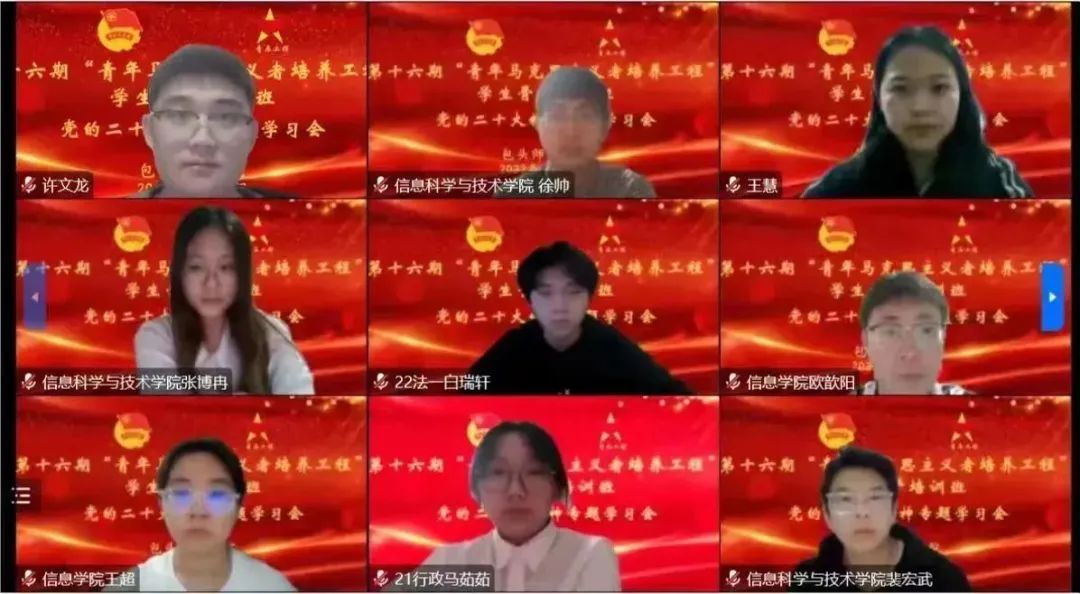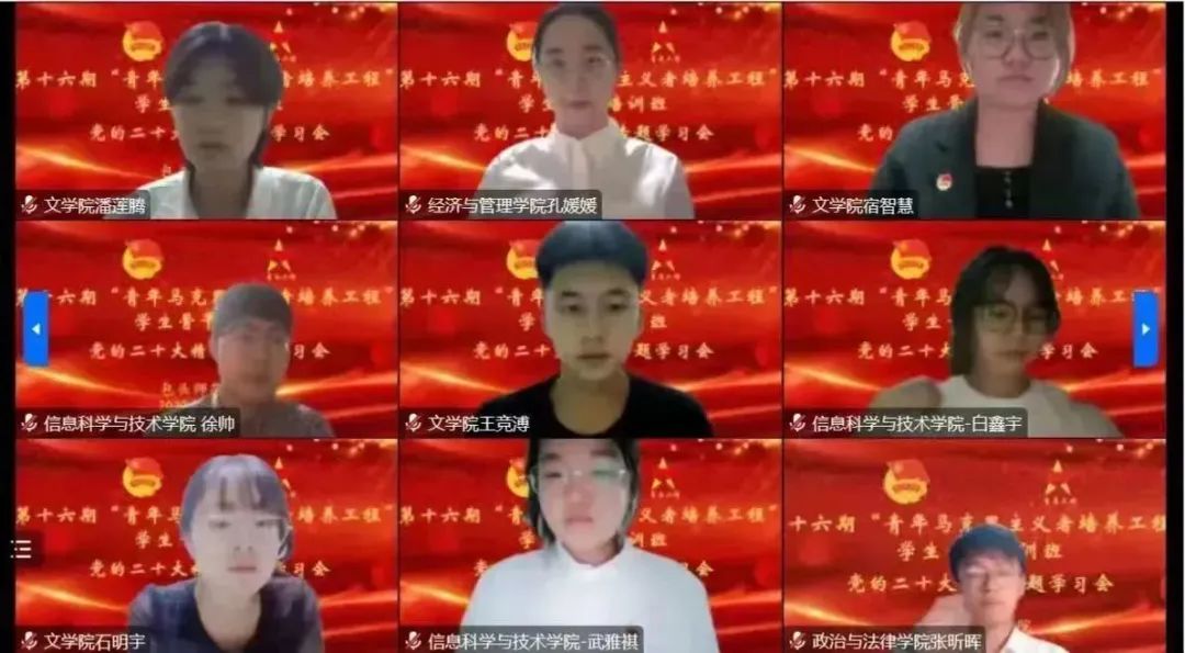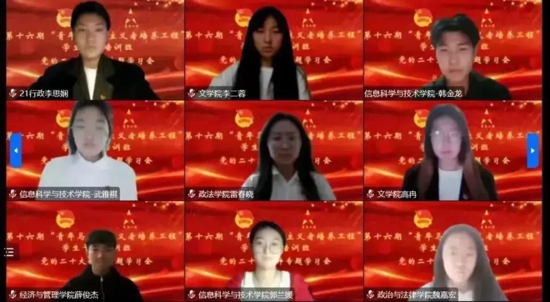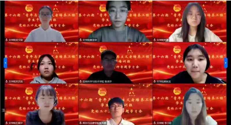 本期培训班坚持政治性、突出思想性,牢牢把握培养中国特色社会主义事业建设者和接班人这个根本任务,以专题讲座为主要形式,采取线上“集中培训+撰写心得感悟+集中汇报”的方式进行,聚焦党的二十大精神的学习宣传贯彻,把青年学生的思想和行动统一到党的二十大精神上来,把智慧和力量凝聚到落实党的二十大确定的目标任务上来,让青春在全面建设社会主义现代化国家的火热实践中绽放绚丽之花!