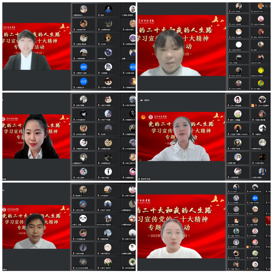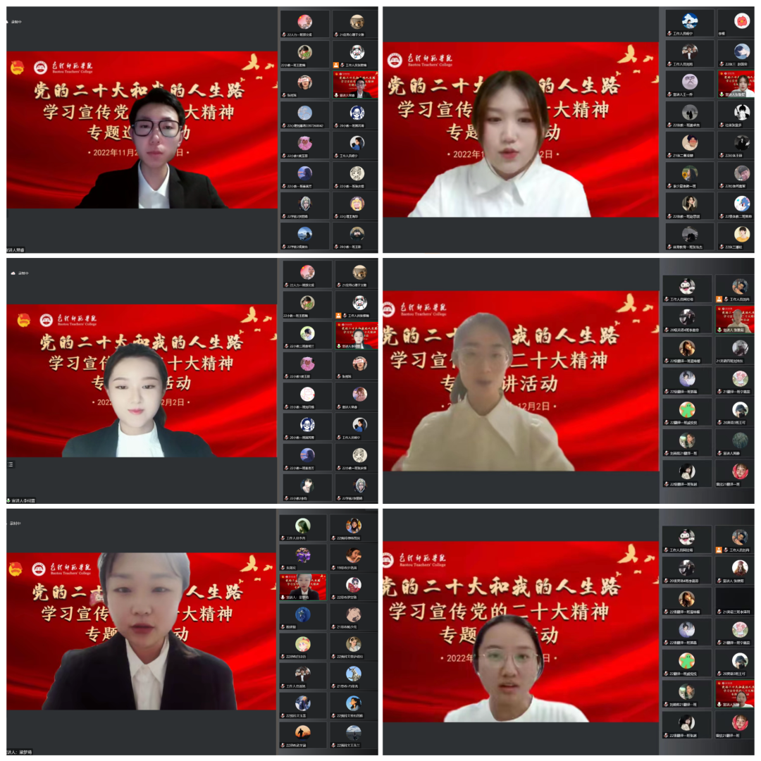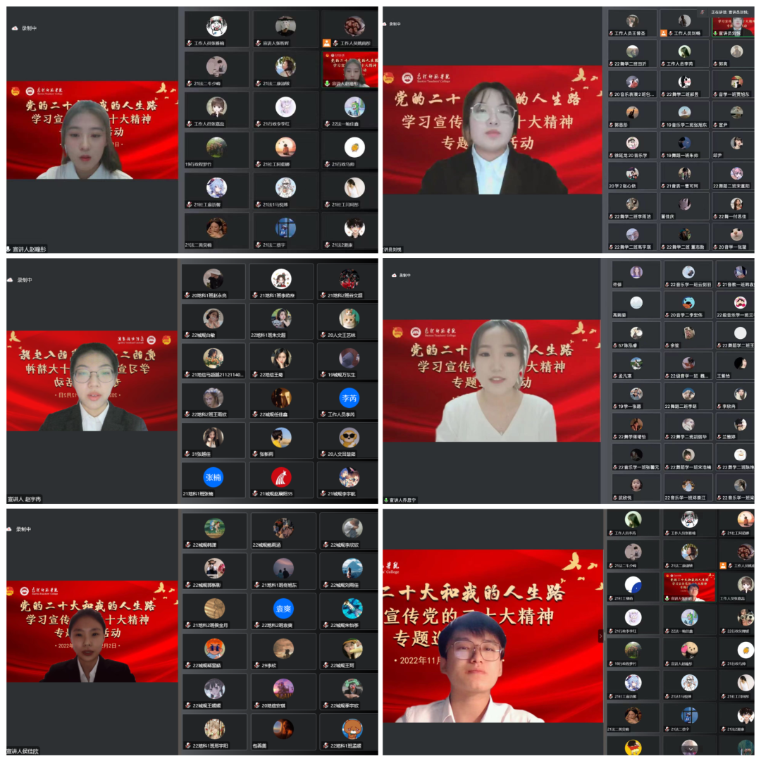 为深入学习宣传贯彻党的二十大精神,11月20日——12月2日由大学生形势政策教育宣讲团成员、中央宣讲团宣讲会我校参会学生代表、“青年马克思主义者培养工程”培训班优秀学员代表等28名宣讲员组成的联合宣讲团,通过线上形式面向各二级学院开展了本次学习宣传党的二十大精神专题学生巡讲活动并获得了良好的活动效果。