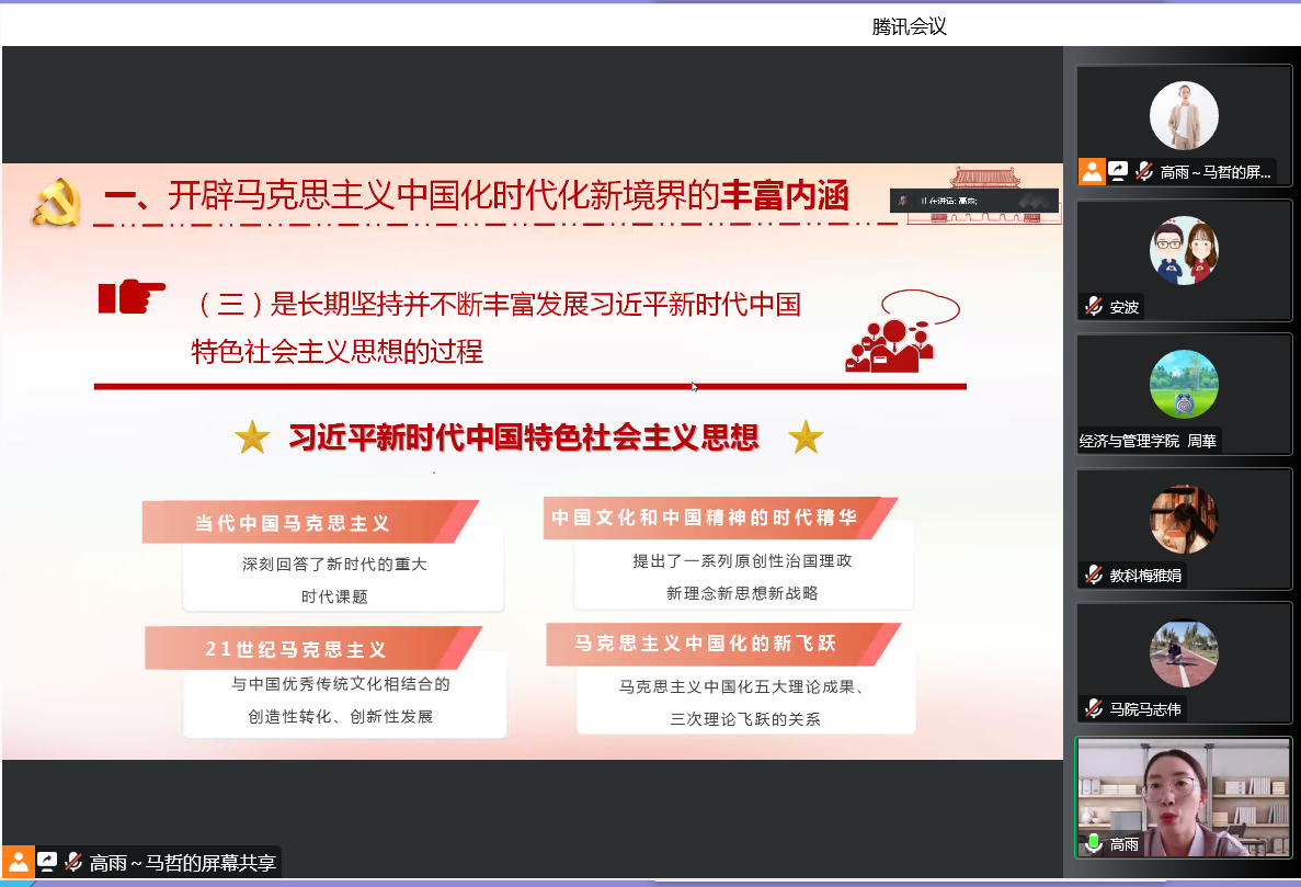 马克思主义学院教师高雨以“开辟马克思主义中国化时代化新境界——学习领会党的二十大精神”为题,围绕“开辟马克思主义中国化时代化新境界的丰富内涵”“开辟马克思主义中国化时代化新境界的基本依据”“开辟马克思主义中国化时代化新境界的实现路径”三个方面为教职工二班作讲座。