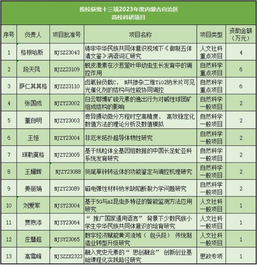 12月5日,内蒙古自治区教育厅公布“2023年度内蒙古自治区高校科研项目”立项名单,我校13位老师获得立项资助。其中重点项目3项,重点项目一般项目9项,思政专项1项。资助金额共计32万元。