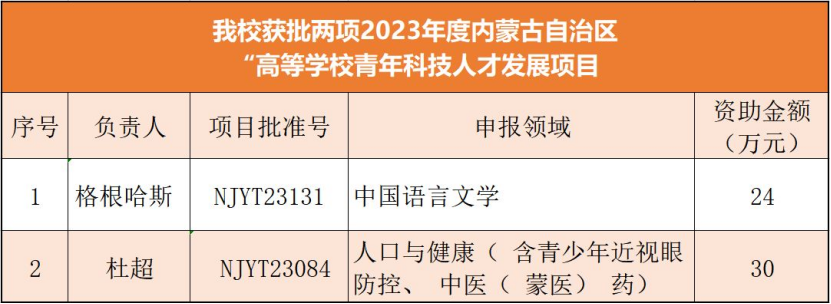 12月5日,内蒙古自治区教育厅公布“2023年度青年科技人才发展项目(青年科技英才)”立项名单。我校格根哈斯老师和杜超老师申请的课题获得立项资助,资助总金额共计54万元。