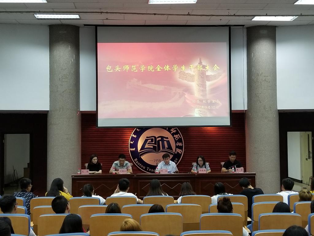 9月10日晚,本学期第一次全校学生干部大会在博学楼学术报告厅隆重召开。团委书记呼禾,团委副书记刘晓娟,团委各科室负责人出席大会,校学生会全体成员,各二级学院学生分会主席,各级社团学生干部共计300余人参加了本次大会。团委素质教育科科长恩合吉日嘎拉主持会议。