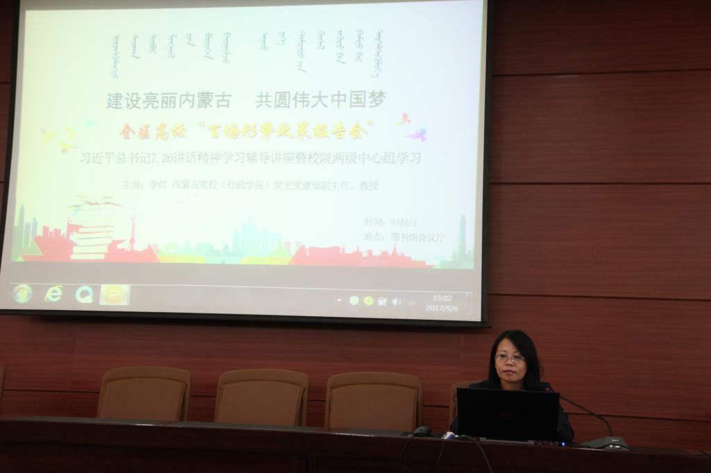 会议邀请内蒙古党校党史党建部副主任李红教授作了题为《高举中国特色社会主义伟大旗帜——学习习近平总书记7.26讲话精神》的专题辅导讲座。李老师从增强中国特色社会主义“四个自信”、中国特色社会主义进入新的发展阶段、建设中国特色社会主义把握的两个原则、坚持发展中国特色社会主义工作重点等四个方面带领大家全面系统深入精准地把握总书记7.26讲话精神的主体脉络、重要思想和重要观点,对下一步深入学习贯彻讲话精神起到了很好的引领作用,帮助同志们更加坚定了“四个自信”,激发人们更加奋发有为、扎实有效地开展好各项工作,以优异的成绩迎接党的十九大胜利召开!(党委宣传部)