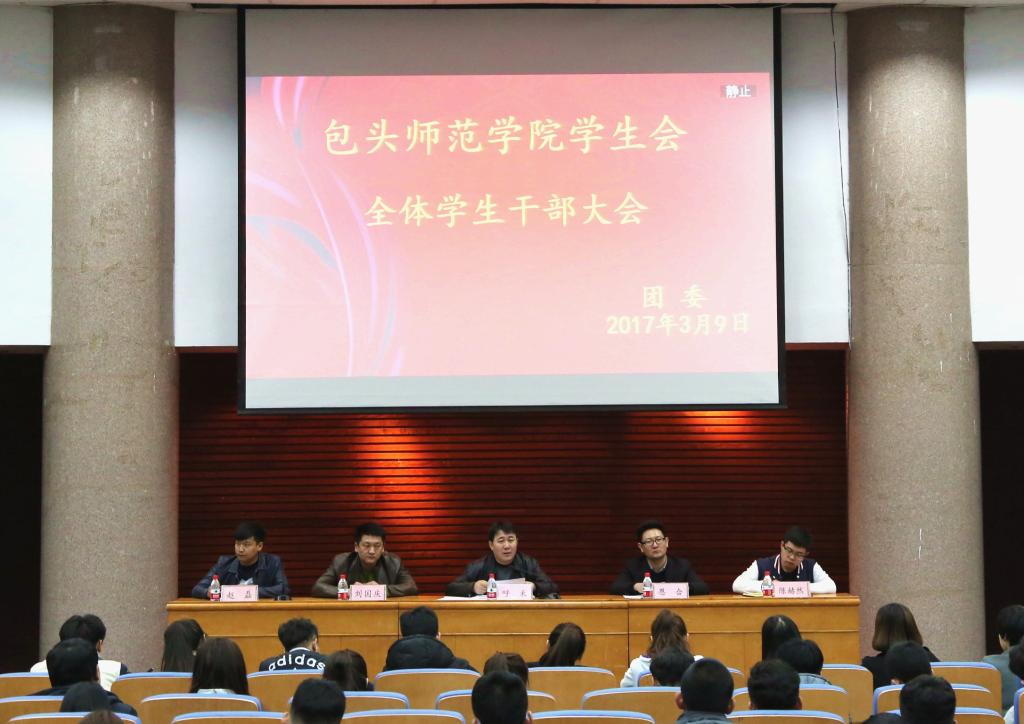 3月9日,本学期第一次全体学生干部大会在博学楼学术报告厅隆重召开。团委书记呼禾老师,学生兼职团委副书记赵磊、团委组织宣传部部长刘国庆老师、团委素质教育部部长恩合老师、校学生会主席陈赫然以及校学生会全体成员,各二级学院团总支副书记,学生分会主席、2016级新生班级团支部书记、班长以及各级社团的学生干部共计350余人参加了本次大会。