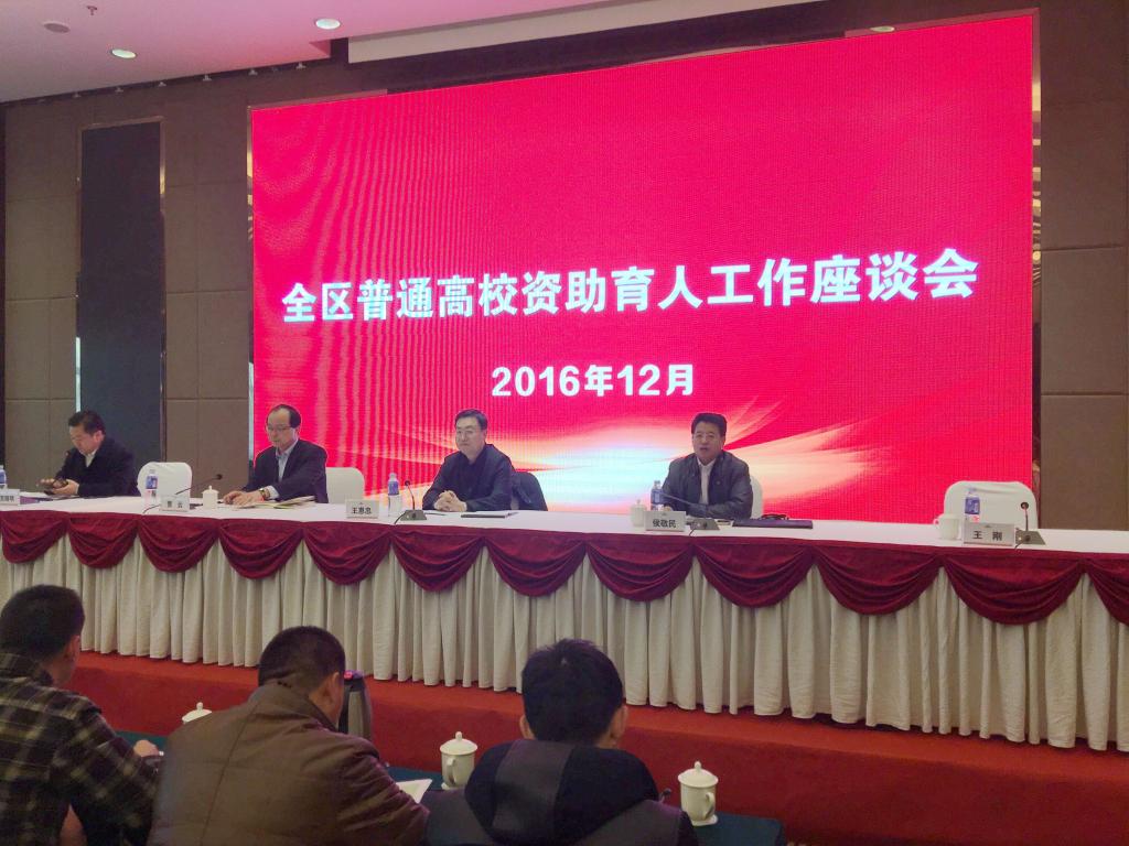 为深入贯彻落实习近平总书记在全国高校思想政治工作会议上的讲话精神,进一步做好我区高校学生资助工作,探讨高校资助育人工作新思路、新途径、新举措,12月27日在呼和浩特市召开全区2016年普通高校资助育人工作座谈会,自治区教育厅思政处负责人、助学管理中心负责人、国家开发银行内蒙古分行客户五处负责人,以及全区56所普通高校学生资助工作负责人参加了座谈会。我校学生工作部学生资助管理中心办公室主任李胜强老师和赵雪晶老师参加了座谈会。
