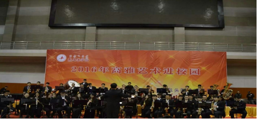 12月7日,由教育厅主办,包头师范学院协办的“内蒙古自治区2016年高雅艺术进校园活动”在包头铁道技术学院正式启动,随后活动在包头医学院和包头职业技术学院陆续展开。“高雅艺术进校园”是由教育部、文化部、财政部以“走进大师、感受经典、陶冶情操、提高修养”为主题组织开展的活动,旨在落实《中共中央国务院关于进一步加强和改进大学生思想政治教育的意见》关于“进一步推进高雅文化进校园活动,丰富校园文化生活,提高学生艺术修养”的要求。本次活动中,我校爱乐梦想交响管乐团演出的节目大都是享誉中外的经典作品,如Van McCoy作曲《非洲交响》、根据邓丽君经典歌曲改编的管乐作品《空港》和《千言万语》、经典和震撼的电影音乐《星球大战》以及民族作品《蒙古族祝酒歌》等,加上萨克斯重奏乐团和大树爵士大乐队的精彩表演,为鹿城学子展示了交响管乐的无限魅力。