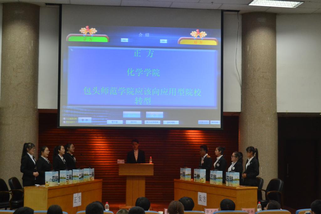 本次比赛采用自治区赛制,设有开篇立论、二辩对辩、盘问环节、盘问小结、自由辩论、总结陈词六个环节。决赛第一场为季军争夺战,化学学院与资源与环境学院围绕辩题“包头师范学院应不应该向应用型院校转型”展开辩论。双方选手结合当前高校人才培养模式及社会发展对人才的需求,立足我校实际展开精彩辩论,缜密的思维和严谨的逻辑给现场观众留下了深刻印象。第二场是冠军争夺战,文学院与经济与管理学院就“大学期间,精通一门学问重要还是全面提高素养重要”展开激烈交锋。双方辩手紧扣辩题,条理清晰,沉稳机智的辩风、流畅默契的团队配合赢得了现场观众的热烈掌声。比赛结束后,保卫处处长盖永涛与学生工作部副部长郭志峰分别对两场比赛作出了精彩点评,他们对选手们的表现给予了肯定,对辩题进行了深入的剖析和解读,并从赛前准备、辩论技巧、提升团队协作能力等方面做了详细的分析与指导,还鼓励辩手们再接再厉,勇于挑战,敢于创新争取获得更大的进步。