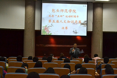 5月4日晚第十七届校园文化艺术节之纪念“五四”运动97周年第五届人文知识竞赛决赛在博学楼学术报告厅落下帷幕。历史文化学院党总支书记,院长胡琮禹副教授、文学院副书记,副院长尚烨教授、党委宣传部理论宣传科科长康震玉老师、历史文化学院历史系主任吕喜林副教授以及文学院陈海波副教授担任了比赛的评委,团委、相关学院的领导、团总支书记、辅导员及学生代表400余人观看了本次比赛。