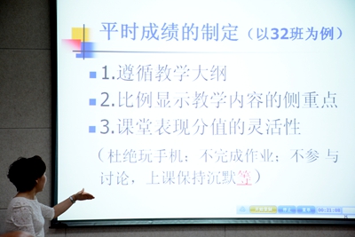首先,外国语学院闫丽霞老师从过程性评价的四大要素:教学大纲的制定、过程性评价的过程、效果及反思向大家讲解了过程性评价在大学英语教学中的应用,将传统教学大纲与过程性评价教学大纲进行了比较,详细介绍了具体的评价内容和手段,并列举出学生课堂表现的考核标准,分享了灵活性打分的方法。闫丽霞老师通过“问卷星”了解到学生的学习状态及对教学改革的意见,及时对教学评价方式作出调整。