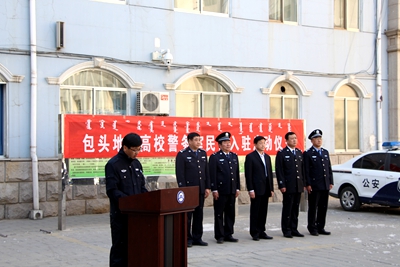 启动仪式上,校党委委员、副院长施纪华代表包头地区高校对包头市公安局的领导和公安干警长期以来在维护高校安全稳定工作中做出的贡献表示感谢,对入驻民警表示热烈欢迎,对学校保卫部门与入驻民警配合,加强警务室工作提出了要求和希望,施院长强调,我校保卫干部要虚心向入驻民警学习,做好工作衔接配合,共同分析情况、研判形势,做好校园及周边治安防控和安全法制教育工作,要加强沟通交流,关心入驻民警的学习、工作和生活,形成警、校深度融合,和谐与共的良好氛围。入驻我校警务室警长白恩慧做了表态发言;包头市公安局党委委员、副局长李英杰发表了讲话,他指出,高校警务室民警入驻标志着高校维稳综合治理工作进入了一个崭新的阶段,要树立“校园安全无小事”的意识,不断加强高校警务室建设,推进警校联动共建平安高校的工作格局,警务室民警要主动向高校领导汇报工作,充分发挥警务室民警专业优势,自觉融入高校安全保卫工作,要大力宣传社会主义核心价值观,建立职责明确、措施到位的处突机制,把 “平安高校”建设提升到新高度。
