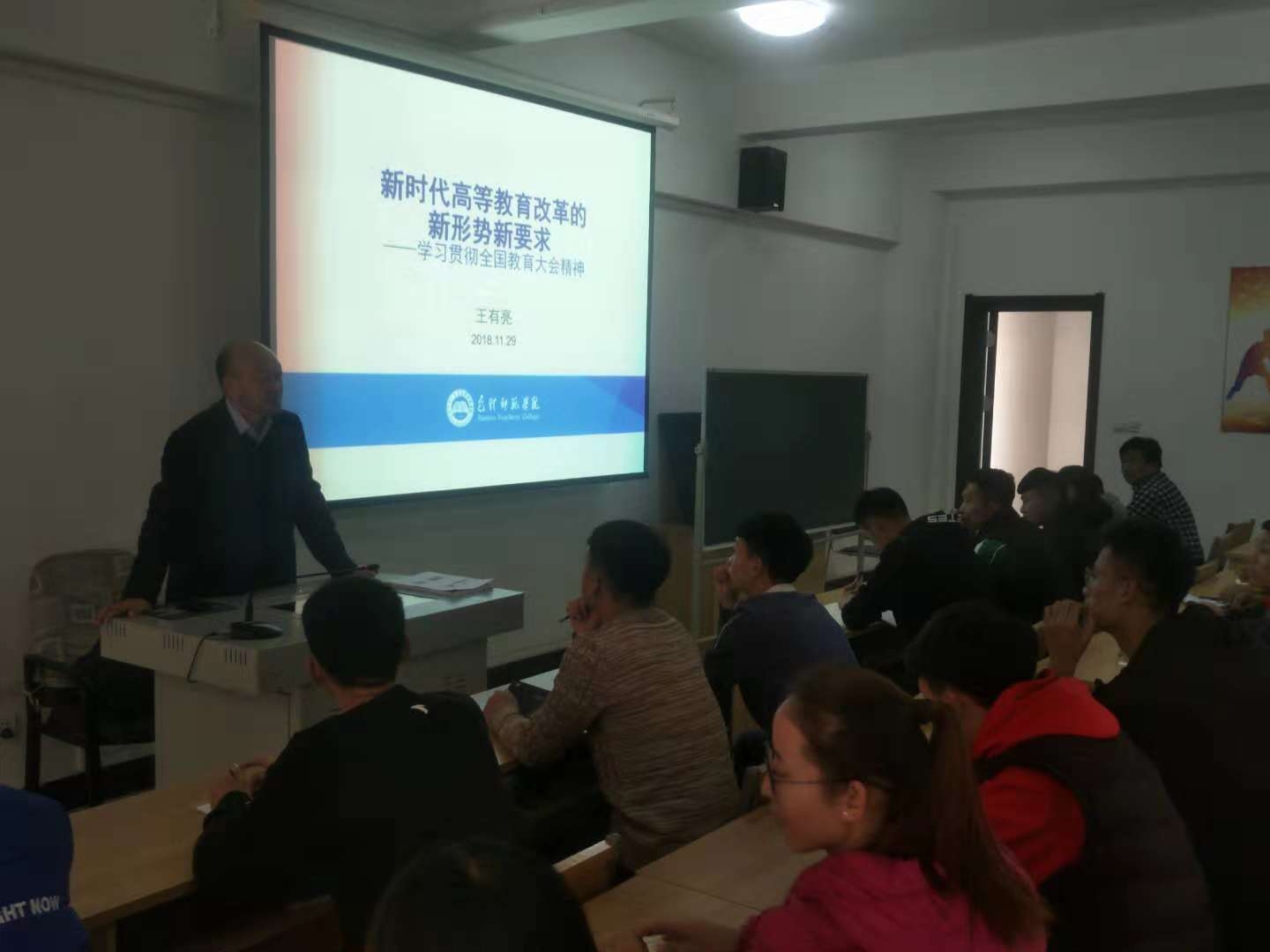 11月29日下午,校党委委员、副院长王有亮在体育学院多媒体教室为体育学院各班班干部、学生党员及积极分子,讲授了题为《新时代高等教育改革的新形势新要求》的形势政策课。
