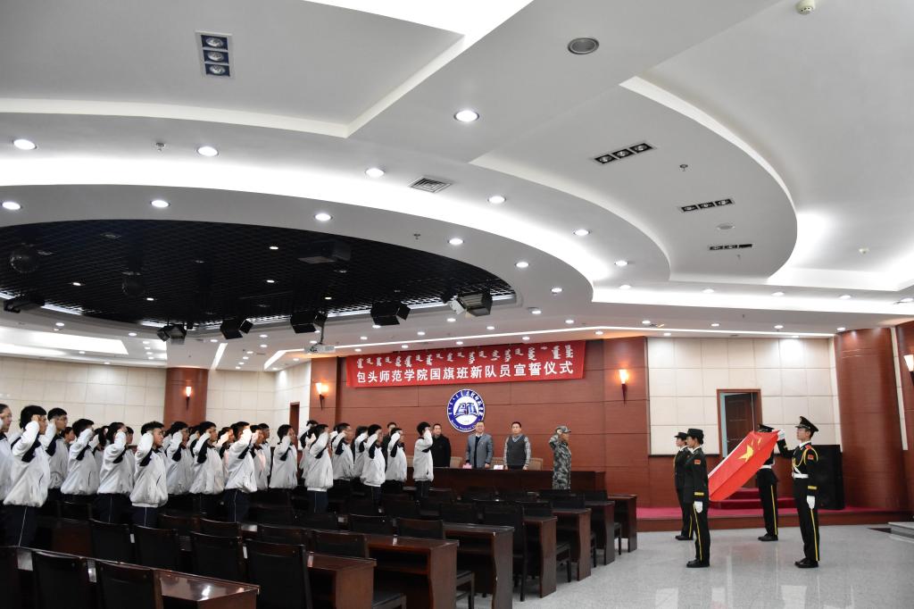 仪式上,蒋永祎同志宣布了学生工作部(武装部)对国旗班新任班长的任命,郭志峰同志宣读了《批准2018级韩爽等45名同学为国旗班队员的决定》。国旗班班长张伟光就新队员的初选、集训、考核、终选工作进行了总结,45名新队员面向国旗举行了庄严宣誓,邢浩坤代表全体新队员做了表态发言。之后,国旗班班主任李胜强老师对国旗班2018年的工作进行总结,并对2019年的工作进行安排部署。