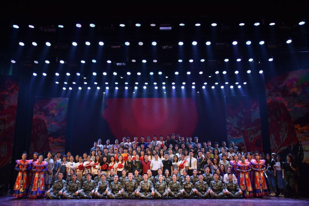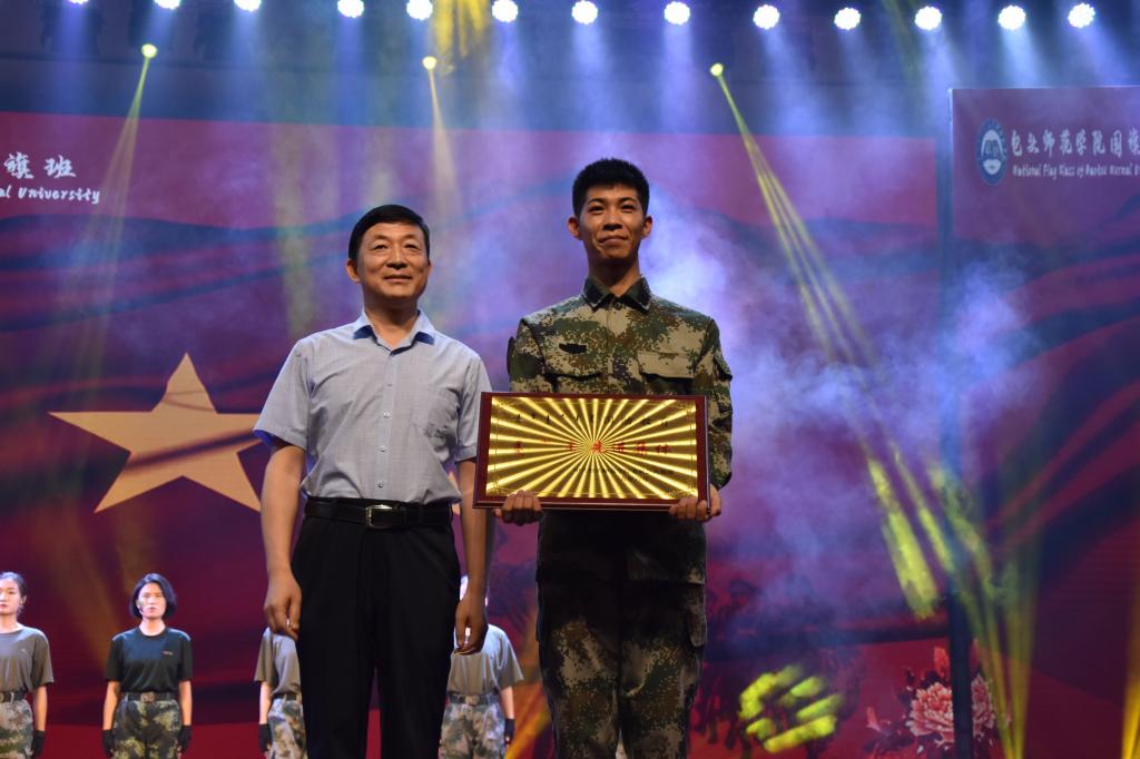 晚会中,党委委员、副院长施纪华代表学校为国旗班授予了“国防教育先进集体”荣誉奖牌,并与呼禾部长、刘运合老师和班主任李胜强老师为身着荣誉大红花的全体2019届老队员颁发了荣誉证书和纪念品。最后,晚会在大合唱《祖国不会忘记》中落下帷幕。