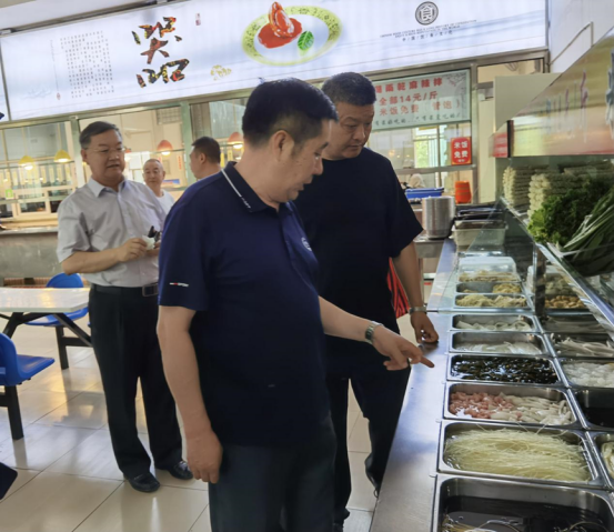 双山同志先后来到北院学生食堂大厅、民族餐厅、洗碗间、食品加工操作间等,详细了解了餐饮中心夏季食堂室内温度的管控措施、剩饭菜的处理办法、燃气安全的定期检查举措等。在北院食堂大厅,双山同志听取了后勤处班子成员及餐饮中心负责人关于民族餐厅菜品价格、燃气管道安全管控、食品留样工作的情况汇报。