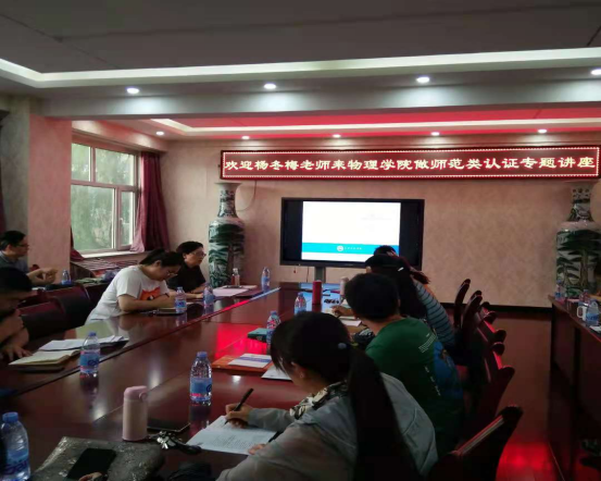 为加强师范专业建设,进一步做好师范类专业认证工作,确保认证准备工作的有效开展,6月21日,教育部师范类专业认证专家、政治与法律学院杨冬梅教授深入物理科学与技术学院讲座、调研、指导认证工作,为学院师范类专业教师作了一场主题为“师范专业认证指标体系解读”的专题讲座。专题讲座在物理学院二楼会议室召开,物理科学与技术学院各教研室主任、各师范类专业负责人及评估相关人员参加了此次讲座。