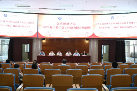 7月13日,学校举办2021年全校干部工作能力提升培训班集中学习会。校领导王永明、金桩、施纪华、王有亮、双山、格根哈斯和全校副处级以上干部、科级干部、党支部书记及内设机构负责人参加学习。学习会由校党委副书记施纪华主持。