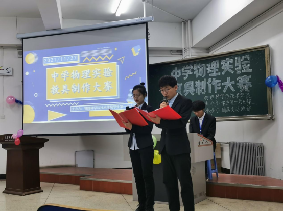 为了践行“请党放心,强国有我”教育实践活动,贯彻教育创新和新课程改革的理念,促进教学内容和教学方法的改革,提升师范生的教具制作能力,物理科学与技术学院学生第一党支部于11月27日晚7点在博学楼204举办了“开拓创意构奇思 巧夺天工制教具”中学物理实验教具制作大赛,大赛由物理科学与技术学院学生第一党支部书记王兴生老师,研究生石雪峰、张玲担任本次比赛评委。