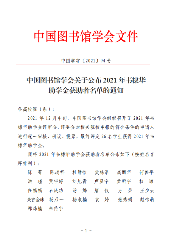 2021年12月中旬,中国图书馆学会组织召开了2021年韦棣华助学金评审会,评委会对相关院校申报的符合条件的申请人进行逐一审核、研议、投票,最终评定26名学生获得2021年韦棣华助学金。历史文化学院2018级图书馆学专业杜静怡同学思想积极上进,学习认真刻苦,成绩优异,最终通过评审获得该基金资助,这是我院学生第五次获得该基金的资助。